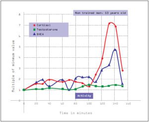 Physical exercise challenges the body by increasing energy demands and placing physiological stress on the nervous, muscular, cardiovascular, metabolic, and respiratory systems. During exercise, the levels of key hormones—salivary cortisol, DHEA, and testosterone—rise in response to the intensity of the activity.